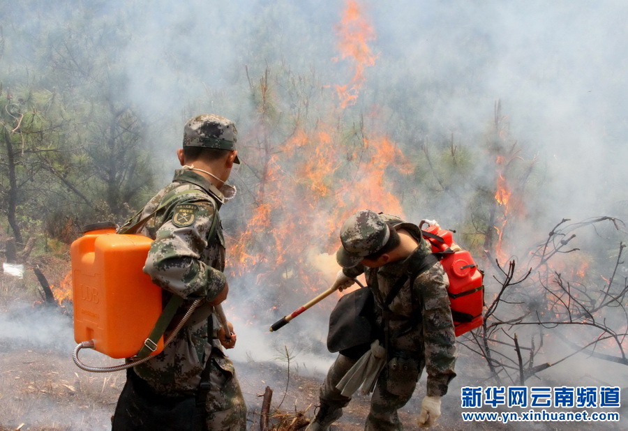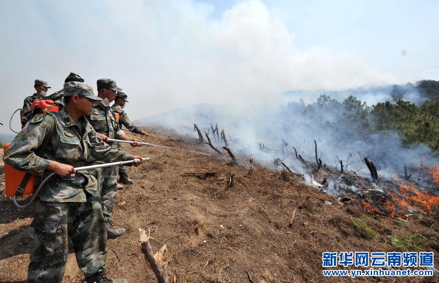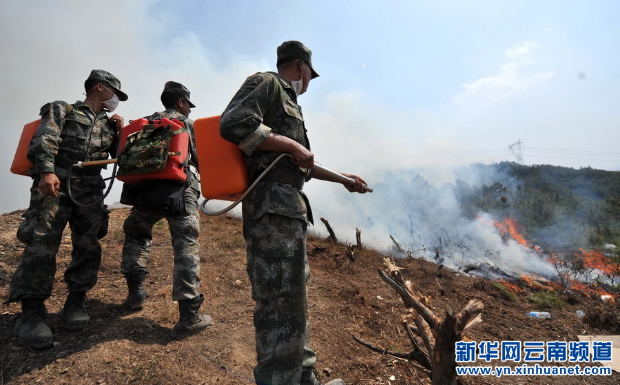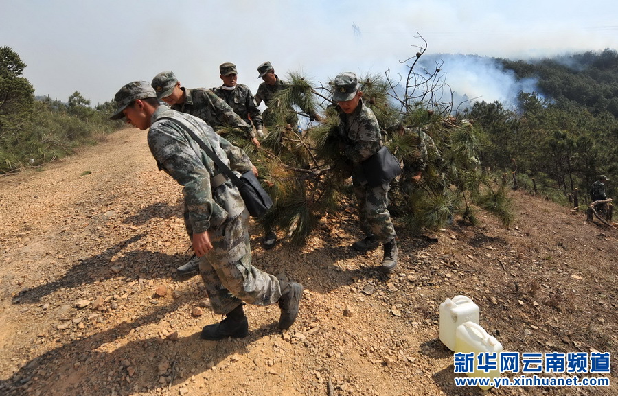3月30日,成都军区驻滇某装甲旅的官兵在云南省晋宁县昆阳街道办事处清水河村的森林火灾现场灭火。