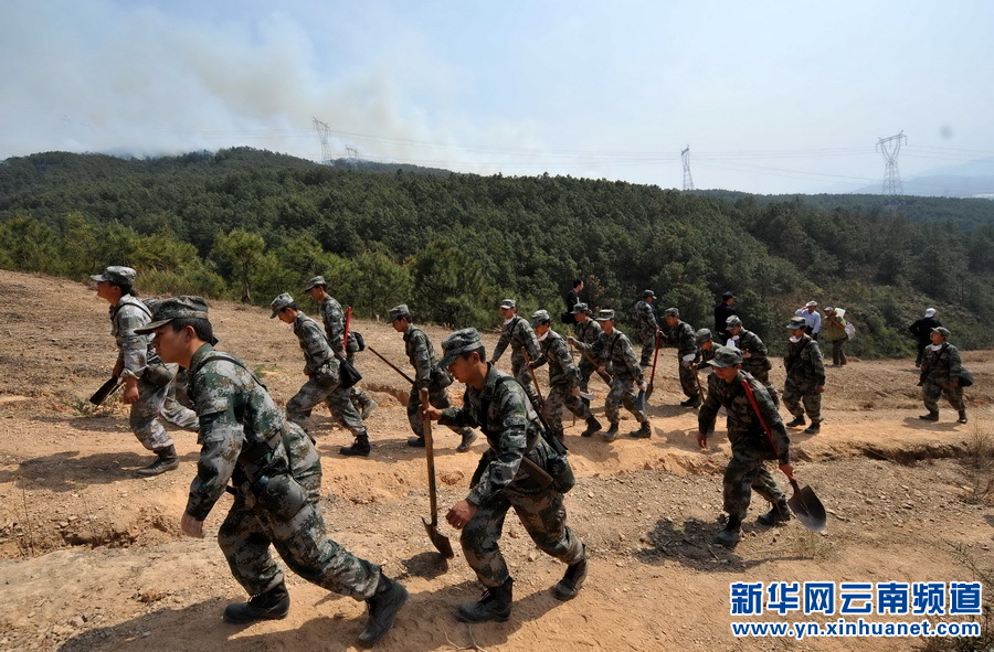 3月30日,成都军区驻滇某装甲旅的官兵在云南省晋宁县昆阳街道办事处清水河村准备上山灭火。新华社记者 蔺以光 摄