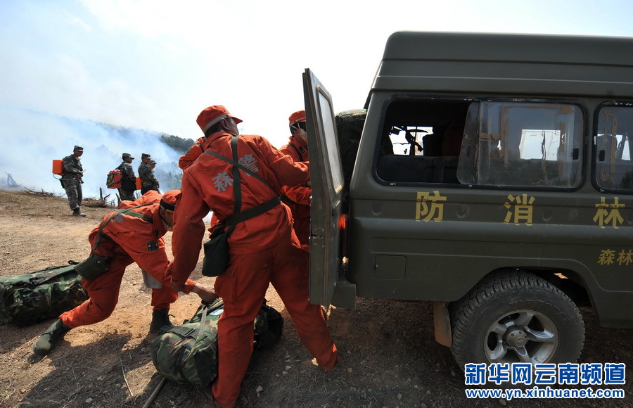 3月30日,森林武警在云南省晋宁县昆阳街道办事处清水河村的森林火灾现场卸下装备,准备灭火。新华社记者 蔺以光 摄