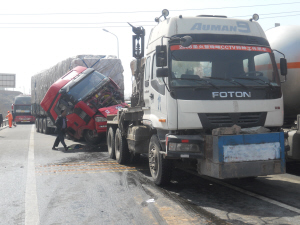 “也许是车牌号为冀B·PS99挂的货车刹车失灵了,该车撞在前方小轿车尾部后,推着前车继续向前,造成8车连撞事故。”兰临高速南收费站一名工作人员称,收费站北侧3公里处一货车侧翻后,道路清障工作尚未结束,事故货车还未拖走,所以收费站对入城道路进行短暂封闭,等待清障结束后恢复通行,但没想到,等待通行的车辆却因为后方车辆刹车失灵引发再生事故。