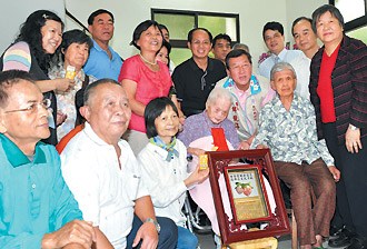 2011年重阳节,新竹县长邱镜淳(中蓝领者)曾拜访徐温绸妹(中紫衣者),献上红包祝贺。图片来源:台湾《联合报》
