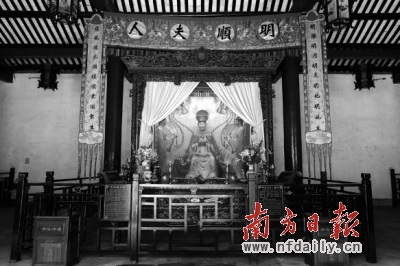 作为火神,祝融的正宫其实是在南岳衡山的祝融峰上,南海神庙也只是他的一个离宫。那很显然,后殿供奉的明顺娘娘自然也不是原配夫人。既然时空是可以无限跨越的,那么上古的神便可以娶到宋代的民间女子。这位供奉海神很给力的顺德民间养蚕女子,传说因还愿时口音不准,南海神误听为想做他的夫人,于是求之不得的立即将她化成泥像,收为内人。又有说是被宋代朝廷顺水推舟的许配给了南海神,做了他的皇妃,让她护佑妇女儿童。
