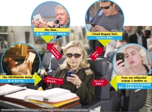短信里都说了什么?只见美国总统奥巴马拿着手机躺在沙发上,底下写着:“嘿,希,你在干吗?”坐在C-17军用运输机的希拉里则冷酷回应:“统治世界。”扎克伯格发短信要求在“脸谱”上加希拉里为好友,结果被拒绝。最让人捧腹的估计是恶搞克林顿夫妇的内容,克林顿被设计成拿着iPhone将给莱温斯基的短信错发给了希拉里,结果希拉里更正丈夫“我是希拉里”。