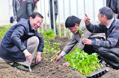 7日上午,罗志军在恒业蔬菜种植合作社的连栋大棚参加农业生产劳动时,与村民亲切交谈。 于先云 摄