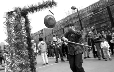 昨日,朝阳区瞰都嘉园社区举行春季趣味运动会,一位居民蒙着双眼参加“盲人敲锣”比赛,只见她手持一根棍子,朝着锣悬挂的位置挥舞,周围不少人为她加油。