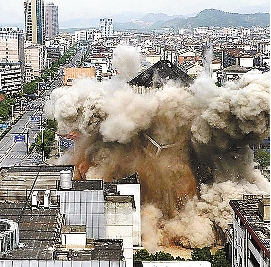 “嘭嘭嘭”,下午2点半,电力大厦里传来三声闷闷的响声,声音不大,但很清晰。人群中发出了“哇”的惊叹声。电力大厦顿时失去了支撑,垂直瘫软下去,一眨眼功夫就夷为平地。