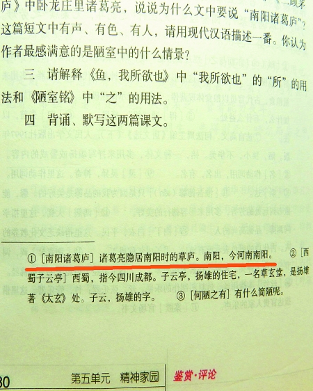 原来,在湖北读初中的小张周末回到老家南阳,跟在南阳上学的小王交流学习时发现,小张学校教材中对《陋室铭》中“南阳诸葛庐,西蜀子云亭”的注释是:“南阳,郡名。诸葛亮的躬耕隐居之地在邓县隆中,属于南阳郡。”而小王所学教材则将“南阳”注释为“今河南南阳”。