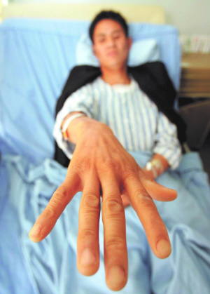 一家人的手指比一般人长约30%,三个哥哥都是在突发胸痛之后陆续无故猝死,“难道下一个就是我?”最小的弟弟最近突然胸痛,他忐忑不安地来到四川大学华西医院检查。一看他的“蜘蛛手”,医生便告诉他,他患的是马凡氏综合征。昨日,记者在医院见到手术后刚拆完线的他。