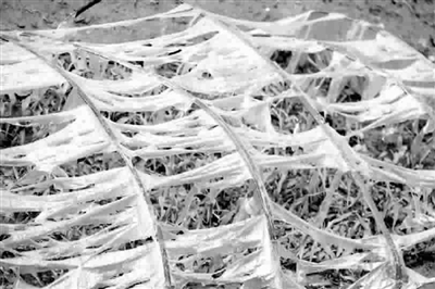 ▲一处地膜覆盖的玉米秧被冰雹打毁