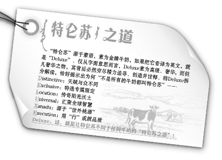 “不是所有牛奶都叫特仑苏”——Deluxe的每一个字母都代表了特仑苏的一种特质。精致外表、高端定制、黄金纬度、科技智能……在特仑苏的世界里,有着诸多你所不知道的Deluxe,让我们一起去感受特仑苏带给我们的另一番美妙天地。