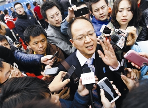 昨日上午庭审结束后谢亚龙的律师金晓光(中)被记者包围。