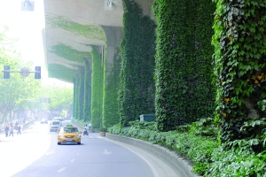 市民说高架桥墩上,绿油油的爬山虎很好看