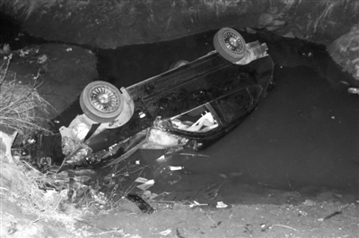 索纳塔轿车侧翻至路旁的排水沟中。