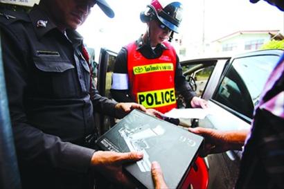 □在金三角区域,泰国军方和警方联合设卡,对来往车辆进行严格检查,图为警方在检查一把玩具手枪。