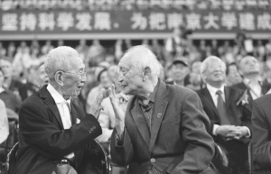 5月20日,参加南京大学110周年校庆的两位年纪最大的校友在前排就座。
