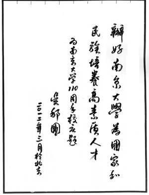 为了恭贺南大110周年校庆,昨天,除了吴邦国和温家宝等领导人专门题词,全国人大副委员长陈至立、江苏省委书记罗志军等领导,更是亲临会场道贺。尽管在对身为政府官员嘉宾的介绍过程中,是按官阶大小排序的,但是活动开场,依然出现了颇为人性化的一幕。