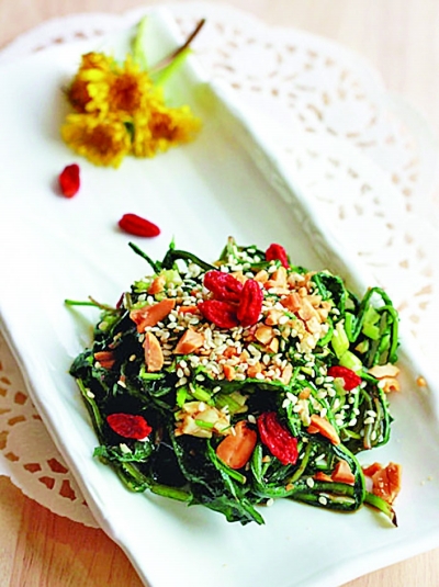 做法:1、将蒲公英叶子摘洗干净,放入热水中焯一下,然后再放入冷水中冷却攥出水分。2、香菜洗净切末,大蒜拍碎。麻辣花生碾碎备用。3、将蒜末香菜末放入蒲公英盘中,加入牛肉粉、酱油、醋、盐、橄榄油搅拌均匀。枸杞用水洗净泡五分钟。4、最后撒上花生碎和芝麻,点缀一些枸杞即可。 柳扬 整理