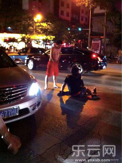 奔驰车主(短裤男)将捷豹车主打翻在地。