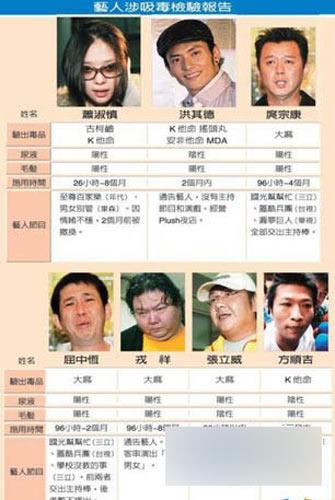 台湾艺人萧淑慎、大炳都屡次吸毒却屡教不改曾经震惊了娱乐圈,其实在台湾涉嫌吸毒的明星绝对不仅仅是萧淑慎和大炳二人,图中便曝光了有吸毒检验证据的便达八人之多,还有加上那些吸食大麻的,那就更多了。