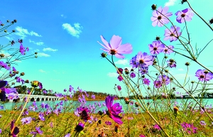 清澈的池塘、碧蓝的湖水、茂密的树林、缤纷的花海……第二次到长东北核心区采访,第一站便是长东北城市生态湿地公园。面对眼前的美景,心里除了震撼,还是震撼。真不敢相信,这就是那个垃圾遍地、水污流浊的伊通河下游泄洪区吗?这就是那个风季尘土飞扬,雨季十年九涝的滩涂地吗?回想起两年前,也是这个季节,第一次到这里采访,车行一路颠簸摇晃,一位工程负责人手拿图纸不停地给大家讲解,记忆中留下的也仅仅是杂草丛生、低洼不平的旷地上,星星点点的几个水坑而已。