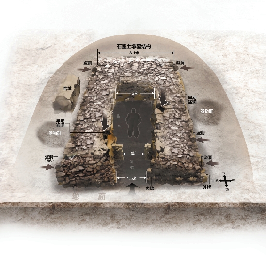 石室土墩墓中,考古人员还发现了7个盗洞,其中2个比较高明,从顶部入手,只需钻透1.5米的内墙即可,是早期盗洞。