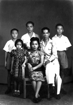 这是新加坡华侨王先树先生的大儿子王裕芬一家上世纪40年代在新加坡的留影(见图五)。大媳妇(前中)是一位来自广州的名门闺秀:岭南人的小巧与灵秀,高高耸起的云鬓,贴身的旗袍式,白色和蓝色的碎花点缀其间。王家设在海口博爱北路的裕大商行,曾是海口的时尚窗口,“裕大”经营的是花色各异的棉布,它所进的货都是当时最时兴的面料。上海、广州乃至南洋流行什么,在“裕大”一般都能找得到。裕大还给海口女人量身定做服装,当然也少不了旗袍。王家不时从新加坡归来的美眷,她们的穿戴自然成为海口女子仿效的对象。