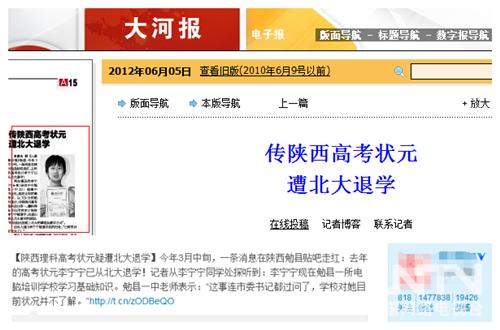 网络新闻联播记者调查发现,6月5日大河报A5版的报道《传陕西高考状元遭北大退学》,是引发这股舆论波的源头。该报道打头称“据《三秦都市报》报道”,之后几乎全部引用了陕西勉县贴吧一则“去年的高考状元李宁宁已从北大退学!”的帖子内容及网友回复。报道以“这事连市委书记都过问了,前几天还问学校这个消息的真假。”结尾。