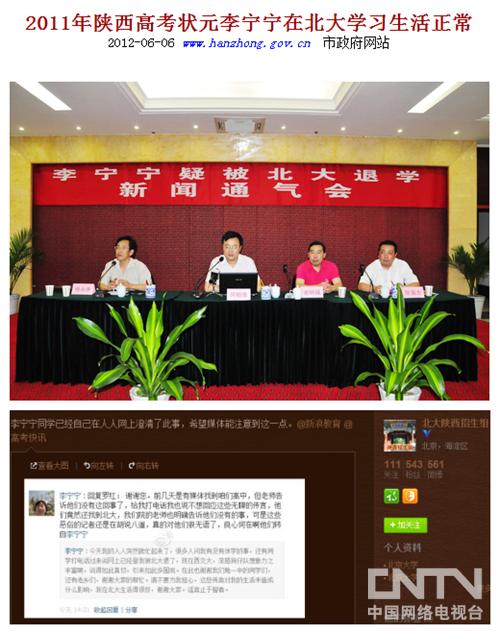 CNTV消息(网络新闻联播记者龚瑛报道)6月5日,一则“传陕西高考状元(李宁宁)遭北大退学”的报道引发关注,部分经认证的媒体官方微博也对此进行了转载。网络新闻联播记者调查发现,此事为谣传。当事人李宁宁通过人人网等途径称“谣言止于智者”,其生源地汉中勉县6月5日专门召开新闻通气会,澄清该不实报道,并称“李宁宁自去年9月进入北大元培学院以来,学习生活一切顺利。”