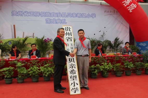 新校园落成典礼仪式上,玉屏希望小学的少先队员向每位嘉宾赠送并佩戴了红领巾。贝亲松村会长发表了援建感言,希望小朋友们成为国家的栋梁之材和未来之星。仪式现场,贝亲公司还向玉屏小学的学生赠送了礼品,希望小朋友们能够健康快乐地成长。