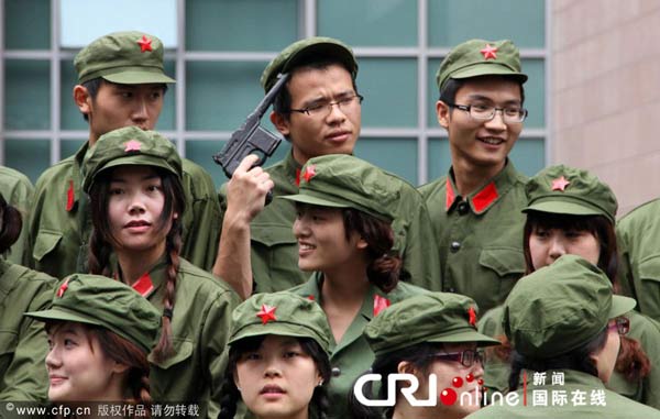 6日国际在线发布了一组武汉华中师范大学的毕业生身着上个世纪的军装样式服装,手拿“红宝书”在校园里拍摄毕业照的照片,随后财经网新浪微博转发,引起了网友的广泛争议。诸多网络名嘴接连炮轰这群学生“不尊重历史”,认为这姿态有着鲜明的“文革”时代烙印,这个国家和民族的有些记忆,是不能用来玩的。同时也有网友认为无需上纲上线。