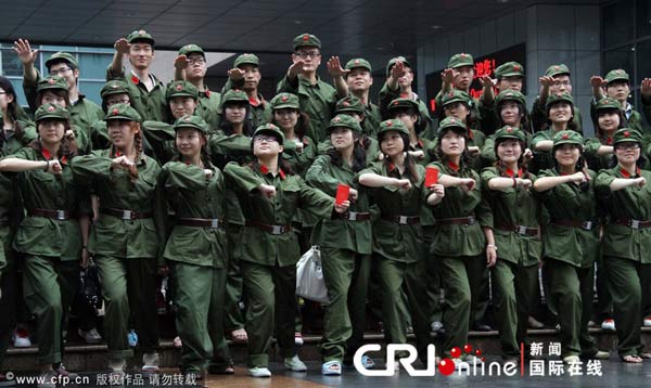 6月6日华中师范大学社会学院的49名应届本科毕业生身穿军装,手拿“红宝书”,做出“忠字舞”动作,在网络引起一片讨论。7日,华中师范大学社会学院和拍照学生称,照片中所穿的只是租借的军装,手捧“红宝书”的造型也是应他人要求做出。
