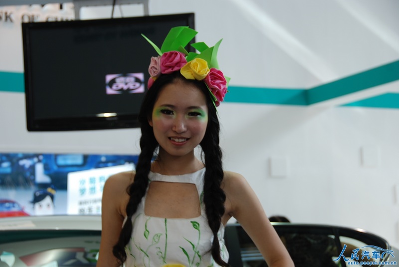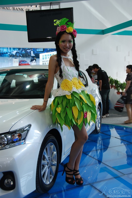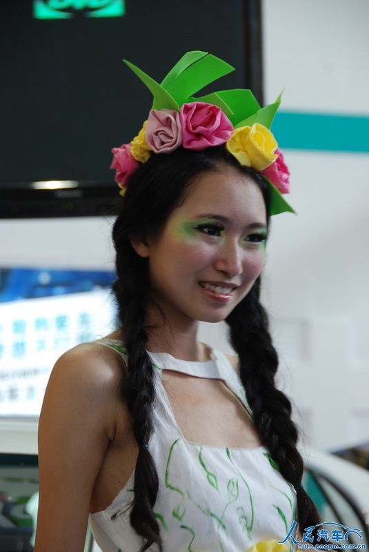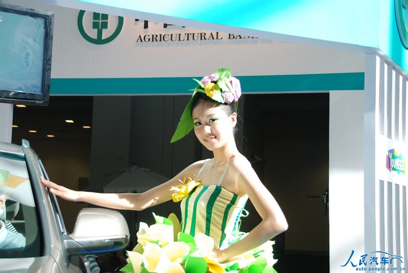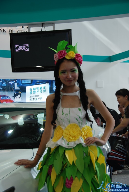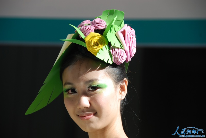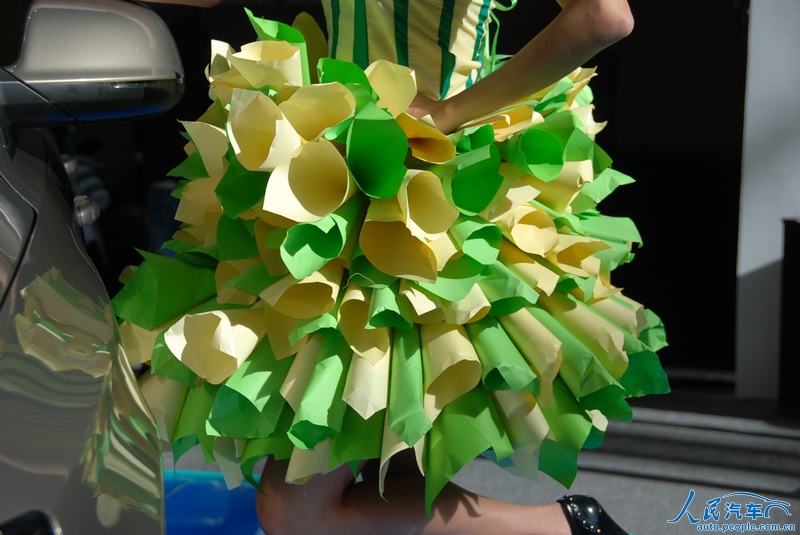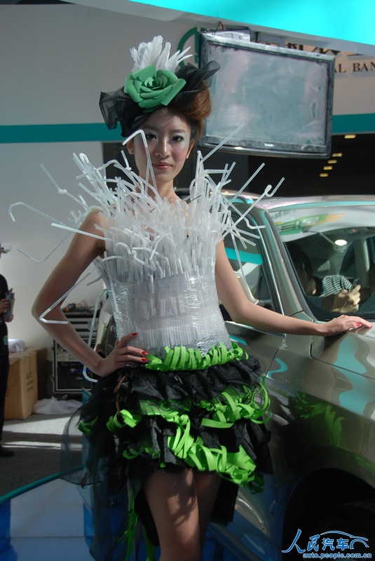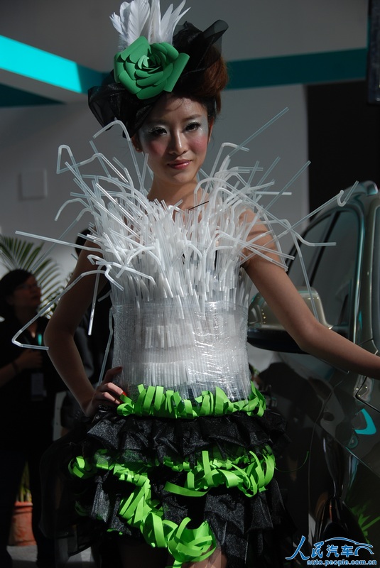 在6月7日开幕的2012深港澳国际车展上,有的参展厂商在车模服饰上也做起了文章,利用废弃的旧物,改造成车模的服装,主打“节能减排绿色环保”牌。