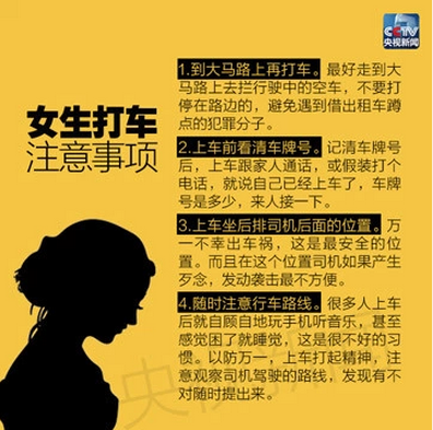 女生打车注意事项1、记下车牌和司机信息给家人 一个人出门,即使是坐正规出租车,也会把车牌号和司机的信息记下来,并发给朋友或者家人。并且,上车后会给朋友打电话,并在电话中“巧妙地告知自己所乘车辆的信息”。2、不要与司机有过多交谈 上车后千万不要睡觉,不要过多跟司机攀谈,更不要随意透露个人信息。不要跟司机发生言语冲突。遇到司机敲诈价钱,别太计较,“保住安全最重要”。3、不跟不认识的人拼车 不跟不认识的人拼车,因为很有可能司机和这些看似拼车的人,其实是一伙的。4、出门不要穿太暴露 在外面等再久也要尽量坐公交或正规的出租车。一个人出门不要穿太暴露,偏僻的地方也不要去。 如果坐车时带了较大数量的现金,千万要单独放在一边,只留一小部分来付车钱。