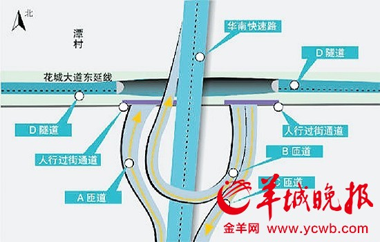 据了解,首期工程除主线道路外,还包括与华南快速路互通的潭村立交、中桥一座(潭村涌中桥)、人行过街通道两座,以及沿线相交的平江路、平云路、员村一横路等交叉口。潭村立交位于天河区员村街潭村东侧, 与华南快速路相连接, 包括A、B、C三条匝道及D 线隧道(如图)。