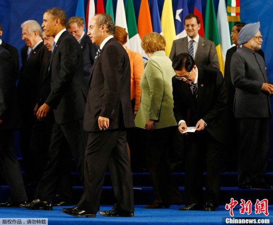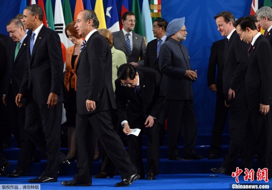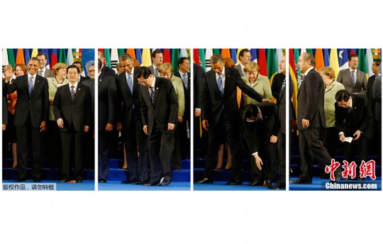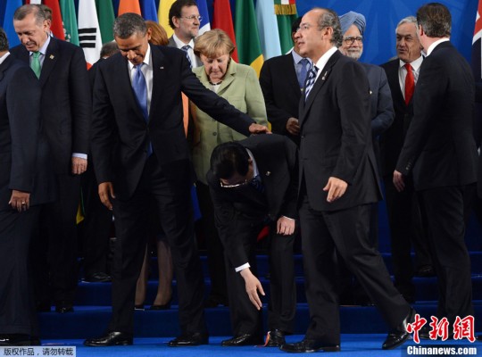当地时间6月18日,二十国集团领导人第七次峰会在墨西哥洛斯卡沃斯继续进行。在当天进行的G20峰会合影中,各领导人的位置都用脚下国旗来标示。拍照后,胡锦涛弯身拾起中国国旗。