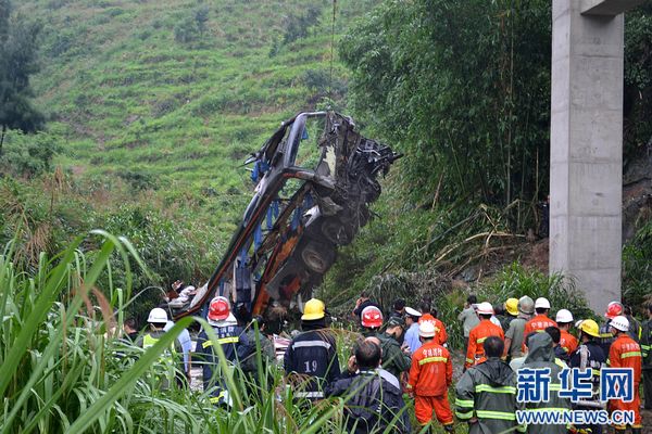 6月20日,事故车辆被吊起。当日2时许,一辆从无锡开往厦门的大巴闽DY5719行经福建省宁德市霞浦县境内沈海高速公路牙城段陇头高架桥时侧翻坠入50余米的深谷。据霞浦县委书记杨培钦介绍,车上共有45人,其中死亡17人、重伤3人,其余人员生命体征平稳,伤员已送到当地医院抢救。新华社发(袁自由摄)
