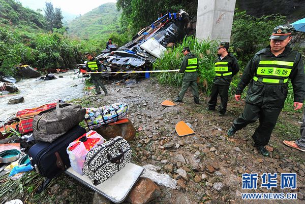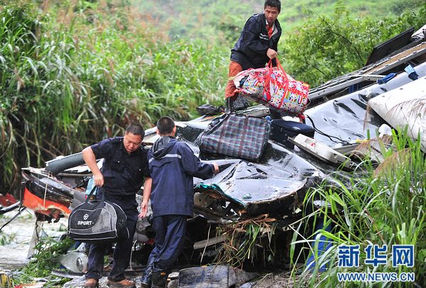 6月20日,救援人员在事故现场整理死伤者的行李。 6月20日2时许,一辆从无锡开往厦门的大巴闽DY5719行经福建省宁德市霞浦县境内沈海高速公路牙城段陇头高架桥时侧翻坠入50余米的深谷。据介绍,车上共有45人,其中死亡17人、重伤3人,其余人员生命体征平稳,伤员已送到当地医院抢救。事故发生后,宁德市公安、消防、边防、交警、路政、医疗救护等部门展开救援行动。事故原因正在调查中。 新华社记者魏培全摄