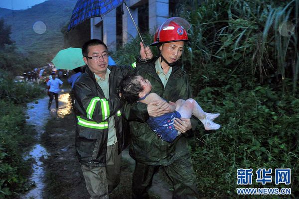 6月20日,救援人员将一名车祸中受伤的孩子转移出现场。当日2时许,一辆从无锡开往厦门的大巴闽DY5719行经福建省宁德市霞浦县境内沈海高速公路牙城段陇头高架桥时侧翻坠入50余米的深谷。据霞浦县委书记杨培钦介绍,车上共有45人,其中死亡17人、重伤3人,其余人员生命体征平稳,伤员已送到当地医院抢救。新华社发(唐海波摄)