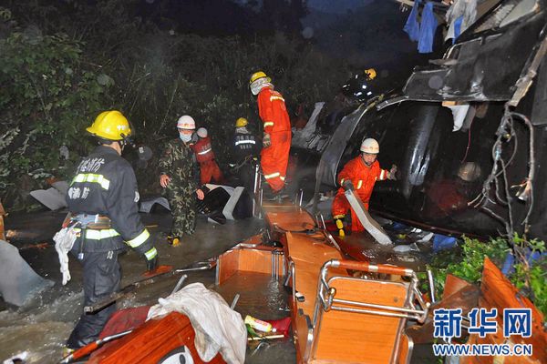 6月20日凌晨,消防人员在车祸现场救援。当日2时许,一辆从无锡开往厦门的大巴闽DY5719行经福建省宁德市霞浦县境内沈海高速公路牙城段陇头高架桥时侧翻坠入50余米的深谷。据霞浦县委书记杨培钦介绍,车上共有45人,其中死亡17人、重伤3人,其余人员生命体征平稳,伤员已送到当地医院抢救。新华社发(唐海波摄)