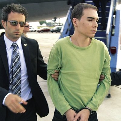 18日,加拿大蒙特利尔,涉嫌杀害中国留学生林俊的马尼奥塔(右)被警方人员带下飞机。