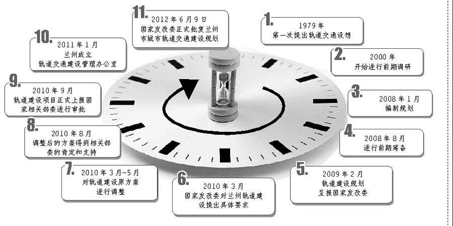 2011年4月15日,国家住建部委托甘肃省住建厅邀请全国城市轨道交通方面的权威专家,对《兰州市城市轨道交通建设规划》进行了评审。2011年7月11日,兰州市委市政府出台了《关于加快轨道交通建设的若干意见》,对轨道交通建设的重要意义和总体要求、征地拆迁和安置等做了明确规定。2011年10月10日,兰州市轨道交通有限公司注册成立,注册资金5亿元。2012年6月9日,经国务院批准,国家发改委以《关于印发兰州市城市轨道交通近期建设规划(2011-2020年)的通知》正式批复了兰州市轨道交通建设规划。(记者 李杨)