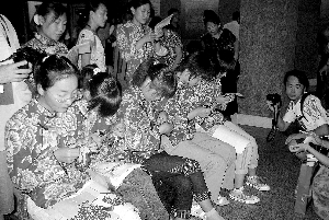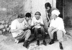 百岁剪纸大师张花女(中)在教女儿柴梅女(左一)剪纸。(1998年摄)