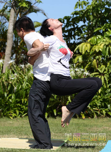 7月3日,黄渤(左)、林志玲在海南陵水清水湾,电影《101次求婚》的拍摄中表演练瑜伽。