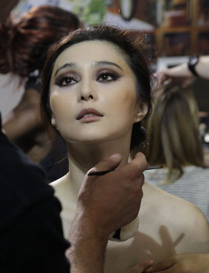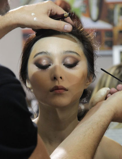 当地时间7月3日,参加2012巴黎高级定制时装周的范冰冰正在秀场后台化妆。准备进行她的“处女秀”。
