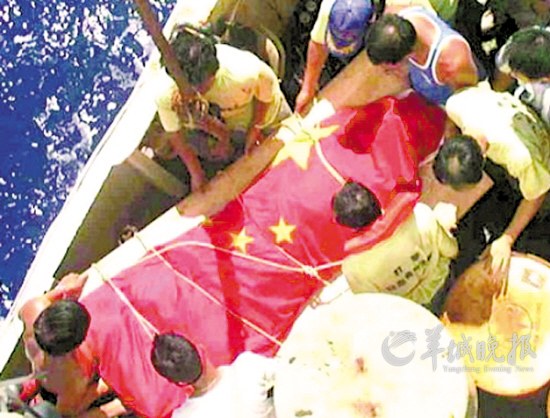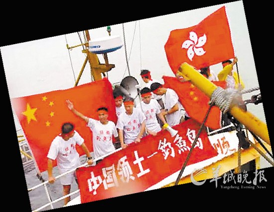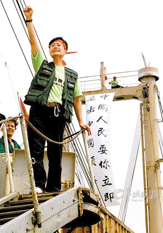 1996年7月,日本把钓鱼岛划入200海里专属经济区,其右翼团体在岛上建灯塔。引发香港12000人、加拿大多伦多5000华人的保钓大游行。9月22日下午,港人陈毓祥率“全球华人保钓大联盟”17勇士乘“保钓号”出发保钓。26日上午9时,为突破日舰围堵,陈毓祥率5名突击队员跳入海中,向钓鱼岛游去,陈毓祥不幸遇难。图为陈毓祥在保钓船上。