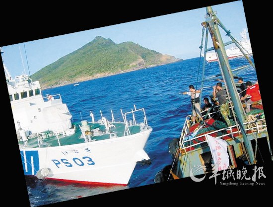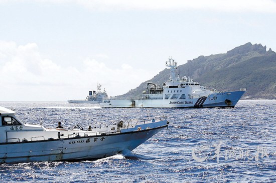 2012年7月3日23时,“世界华人保钓联盟”主席黄锡麟等人驾“全家福”号保钓船,从台湾岛深澳渔港出发前往钓鱼岛宣示主权。图为7月4日上午8时,日本舰艇拦堵“全家福”号登岛。中国外交部为此“敦促日方不得采取任何危及包括台湾同胞在内的中方人员生命、财产安全的举动”。