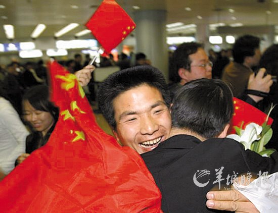2004年3月24日,大陆保钓人士第4次出海,第一次成功登岛。登岛的7个人是冯锦华、张立昆、尹东明、方卫强、王喜强、胡显峰和殷敏鸿。他们拆掉了右翼团体设立的牌位,但登岛小艇被日本汽艇拖走。随后赶来的日本舰艇和飞机将他们带到冲绳关押。图为3月28日晚,7名保钓人士回到北京首都机场,受到了英雄般的欢迎。