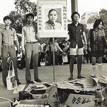 保钓运动的星火发源于1970年九十月间的香港,11月下旬火种飞越太平洋,传播至美国威斯康辛和普林斯顿两个大学校园,并燎原至德国海德堡。图为1970年香港的学生保钓运动。