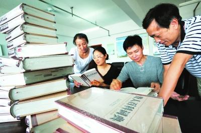 崔吉平(右二)和他的妻子史琍(左二)在介绍由他们领衔编写出版的中国首部《聋人百科词典》。日前,由合肥一对残疾人夫妇——全国自强模范崔吉平和安徽省聋人协会副主席史琍耗时六年领衔编写的国内首部《聋人百科词典》正式出版发行,填补了中国聋人百科全书领域空白。这部工具书拥有1000多个词条,汇集了与聋相关的医学、教育学、心理学、社会学、康复学、语言学、法律学、技术学、文化历史学等多个学科,反映了先进的聋人工作理念、聋人教育思想、听力言语康复的最新进展以及当代聋人生活的最新成果和产品。 新华社 发