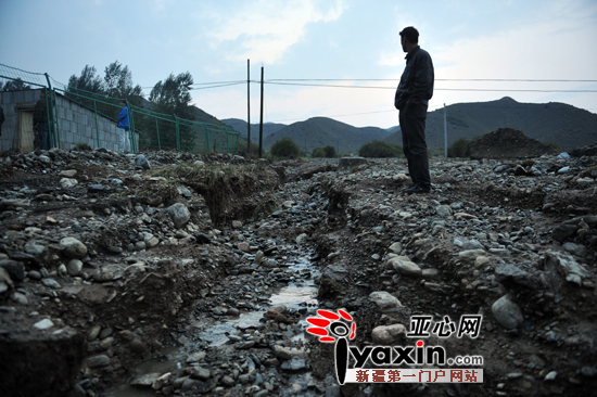 泥石流过后,赵家庄子的一名村民站在泥石流经过的废墟处望着泥石流来袭的远方很久很久。亚心网记者 赵宇飞 摄